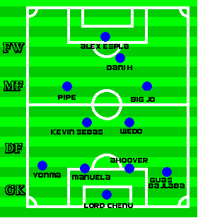 GK/GM 5 YONMAR ESP/FR LD/LI 6 MC BUSHCHOPPA*** ESP/FR RD/LD 7 DANI H (c) ESP ATT/DEL 8 TOUGAS PORT/LUX RAM/MAD 9 ALEX ESPLA (c) ESP ATT/PUNTA 10 KEVIN SEBAS VENEZUELA CM/MEDIO 11 MR CALIMAN COLOMBIA DEF/CENTRAL 12 BIG JO BELGIQUE LAM/MAZ 14 WEDO FRANCE CD/MEDIO 69 LA MANUELA (a) ECU/CR (2GK) DEF/CENTR |